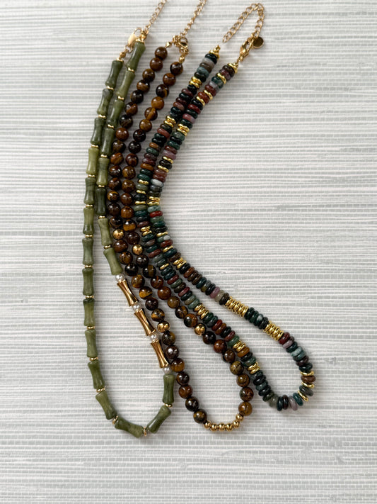 Chocolate is SO in! This stack features greens, browns and golds that perfectly complement each other. Bonus tip: each of these pieces look great with the Cindy Equestrian Coin Necklace!