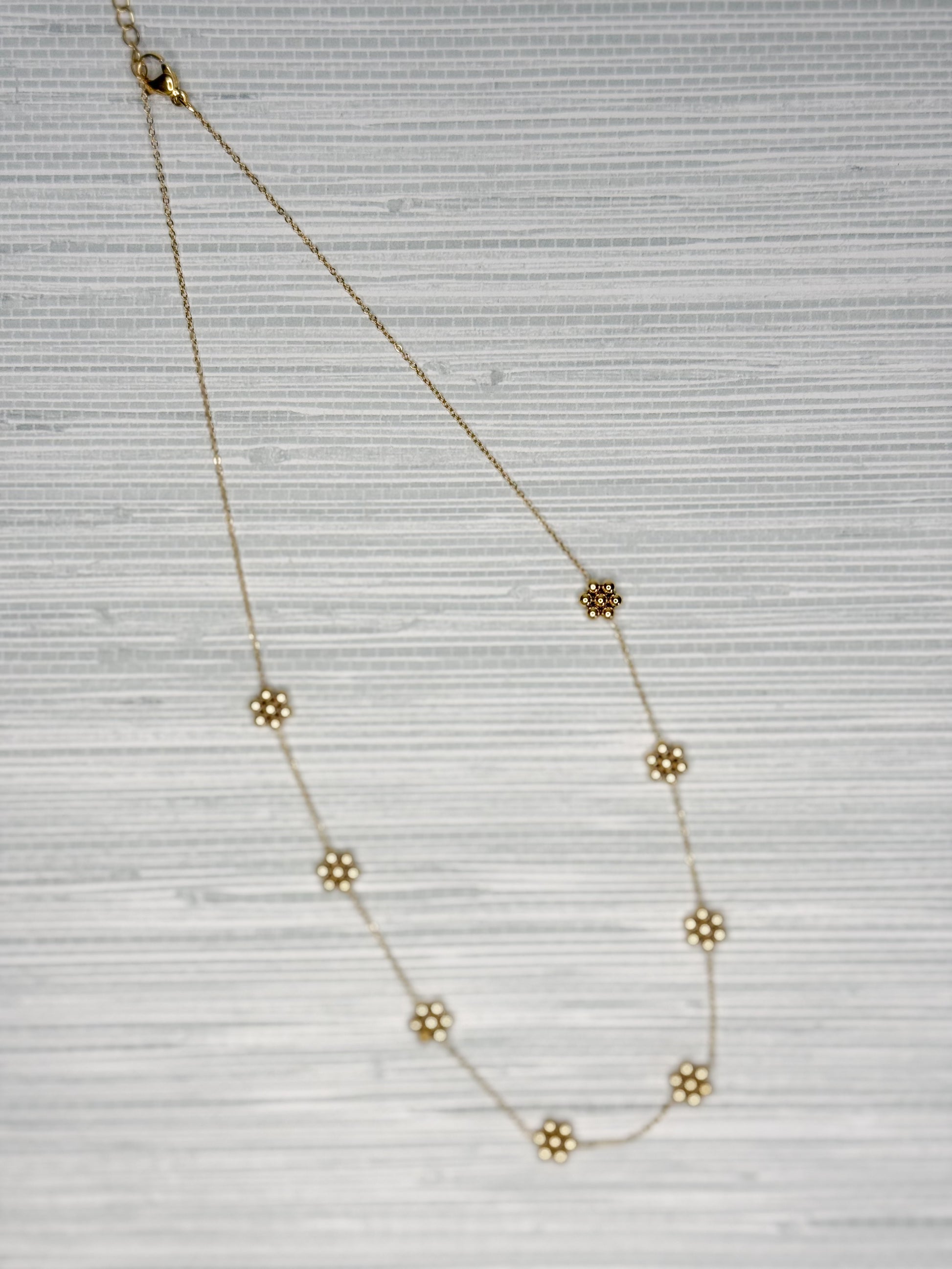 This Dainty Golden Bead Flower Necklace features tiny ball bead flowers with a dainty chain, creating an elegant and eye-catching look. Perfect for any occasion, this necklace is easy to dress up or down. It's beautiful to wear it alone or a great layering piece to complete your outfit. Approximately 16" with a 2" extender 18k gold plated stainless steel Lead and Nickel free
