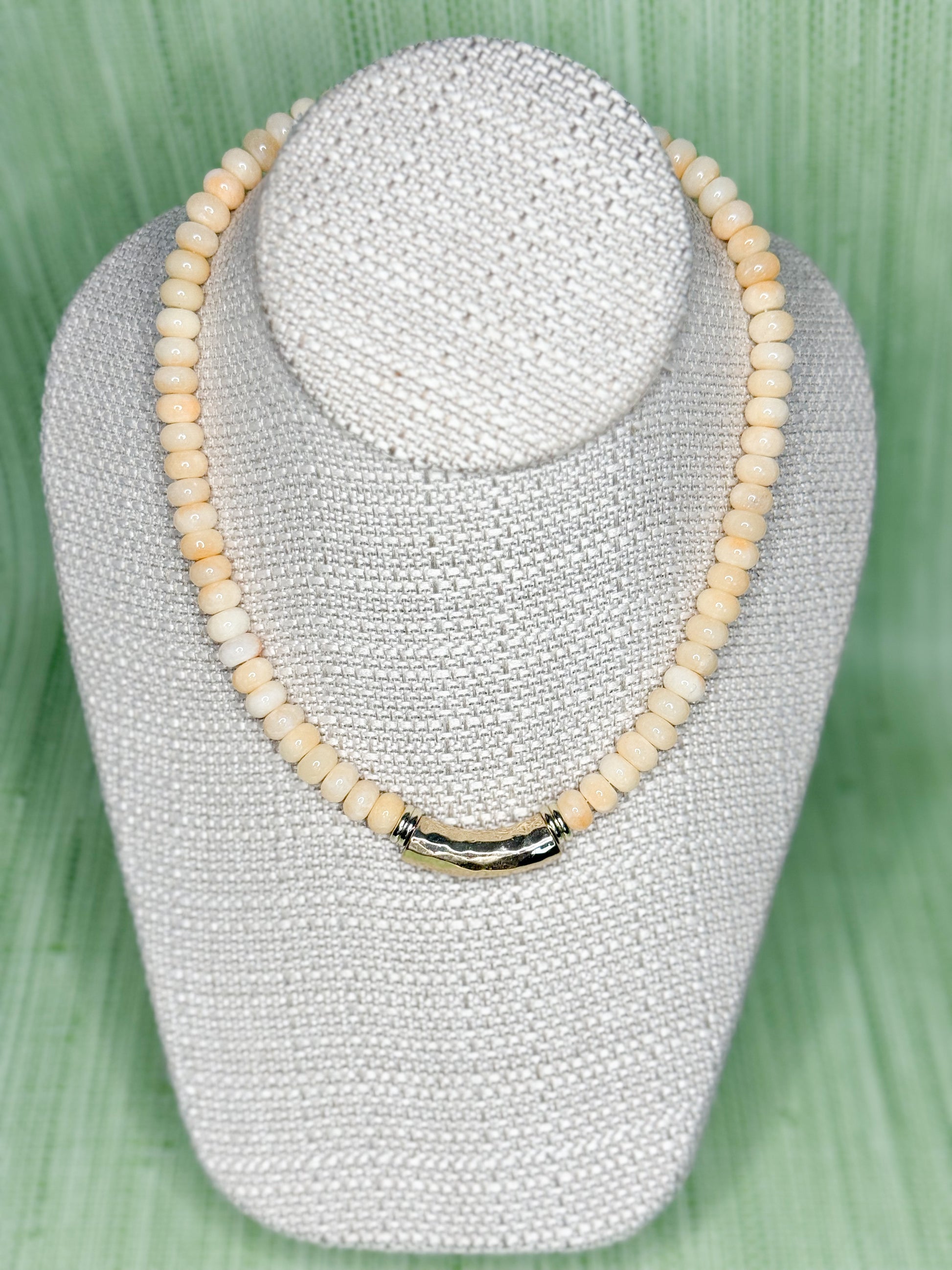 This 17" necklace features peach gemstone beads and a magnetic clasp