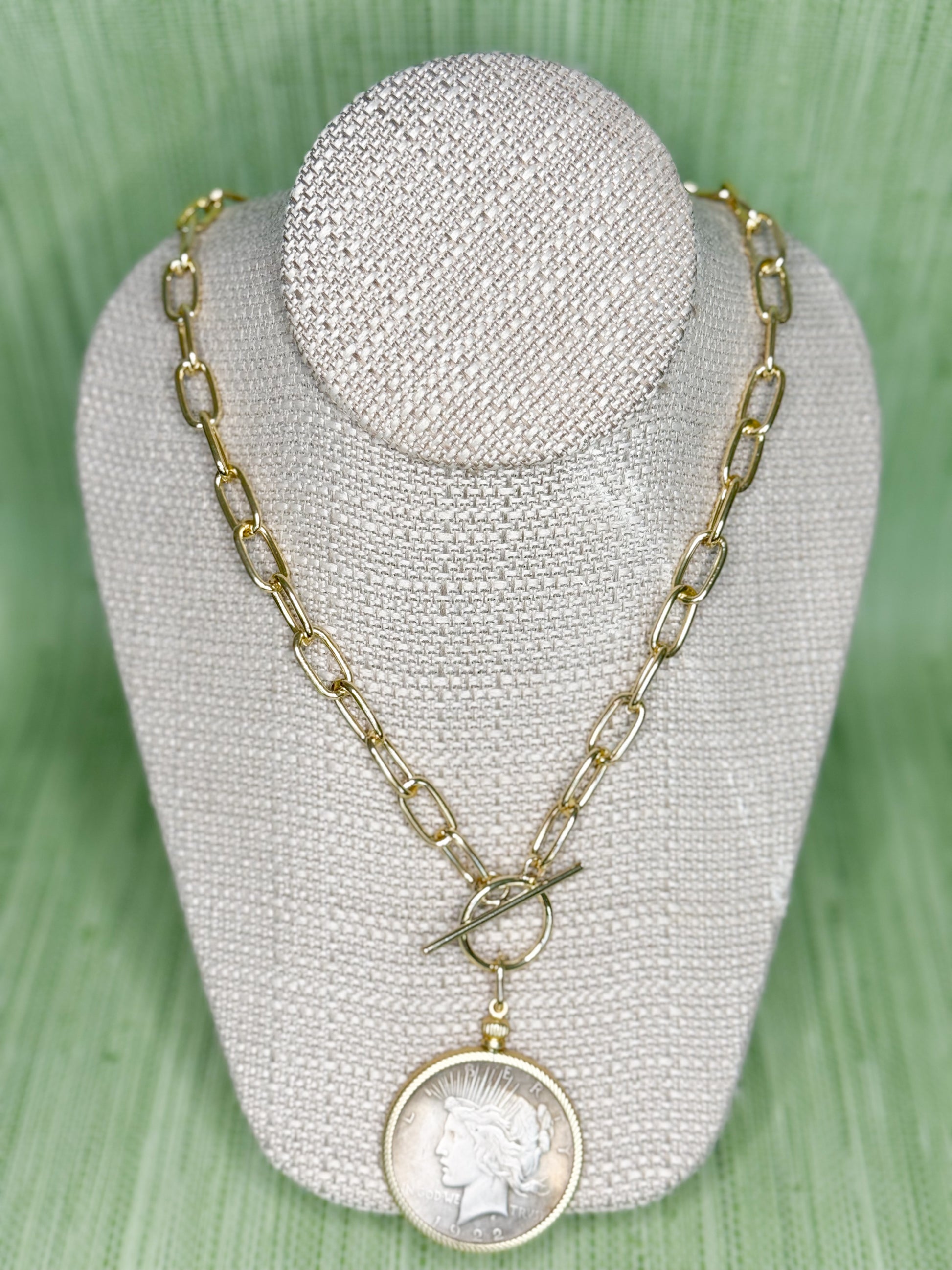 A number one seller! These coin necklaces are so fun to wear. Dress them up or wear them with your favorite jeans and tee. Non-tarnishing chains, stainless steel & aluminum, coins may vary 19” chain 50mm coin.