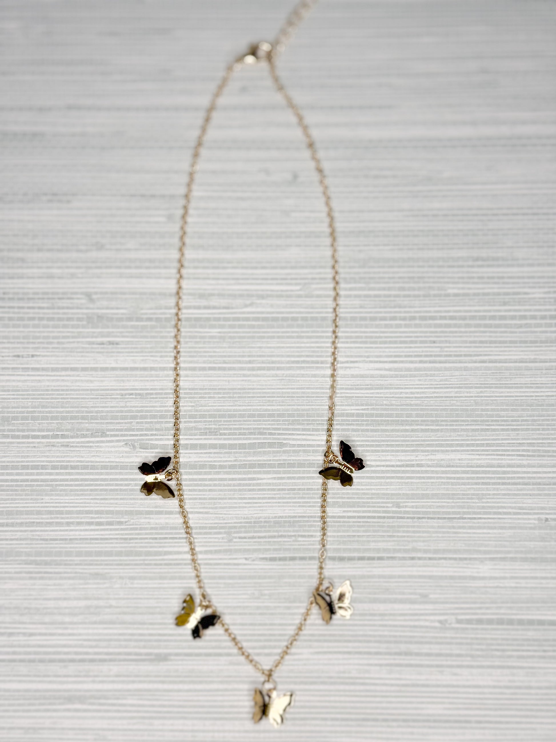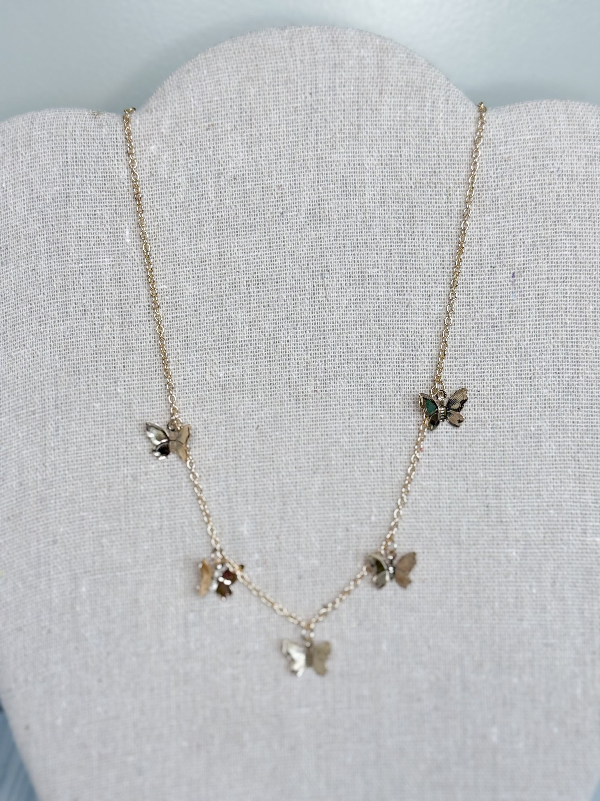 A stunning stylish necklace with five dainty butterflies attached evenly throughout! Such a statement piece necklace it's great for everyday wear. - Dimensions: 16 inch chain with a 2 inch extender. - Lead and Nickel Free. - Metal link chain. Brass butterfly charms.