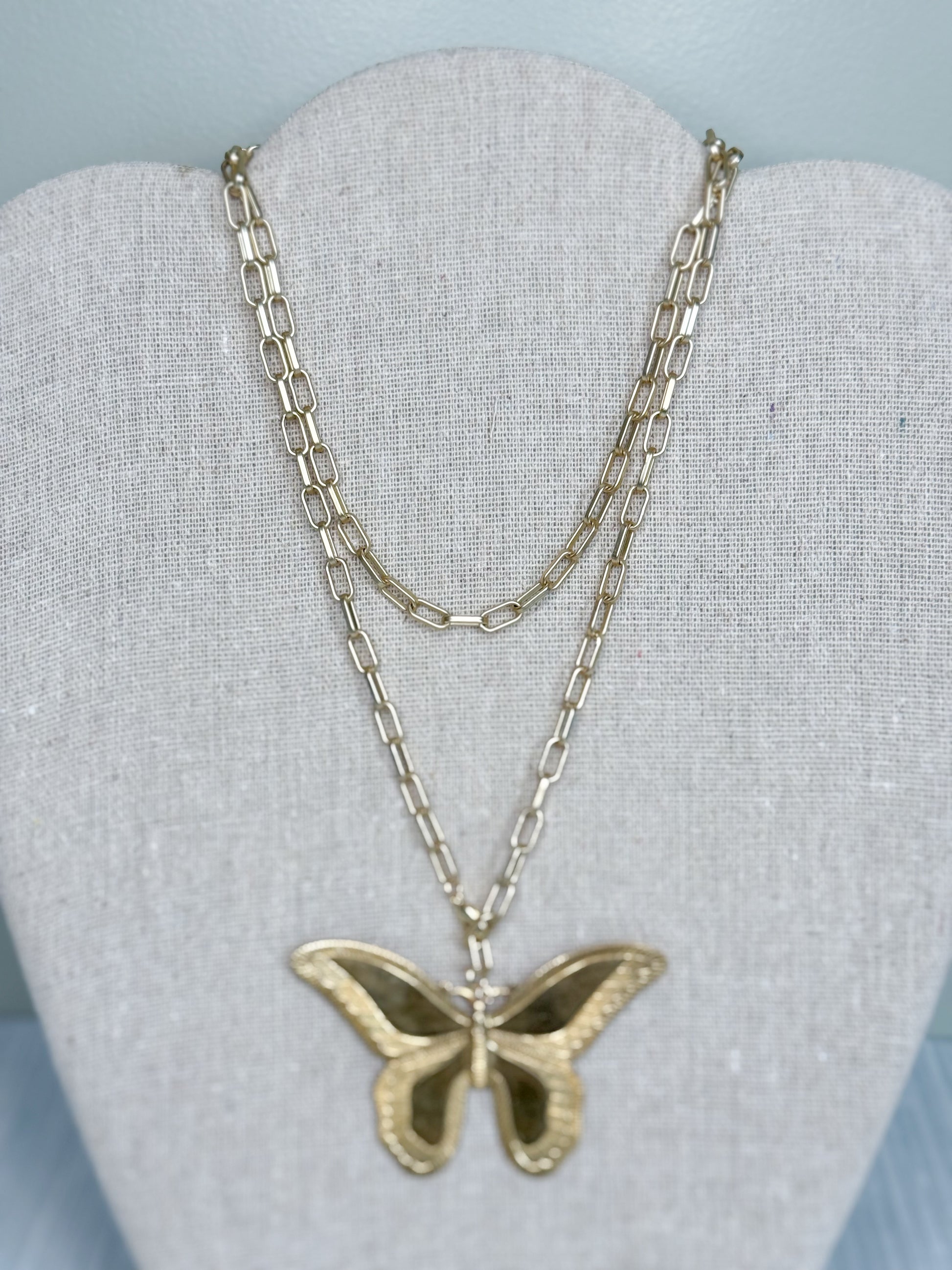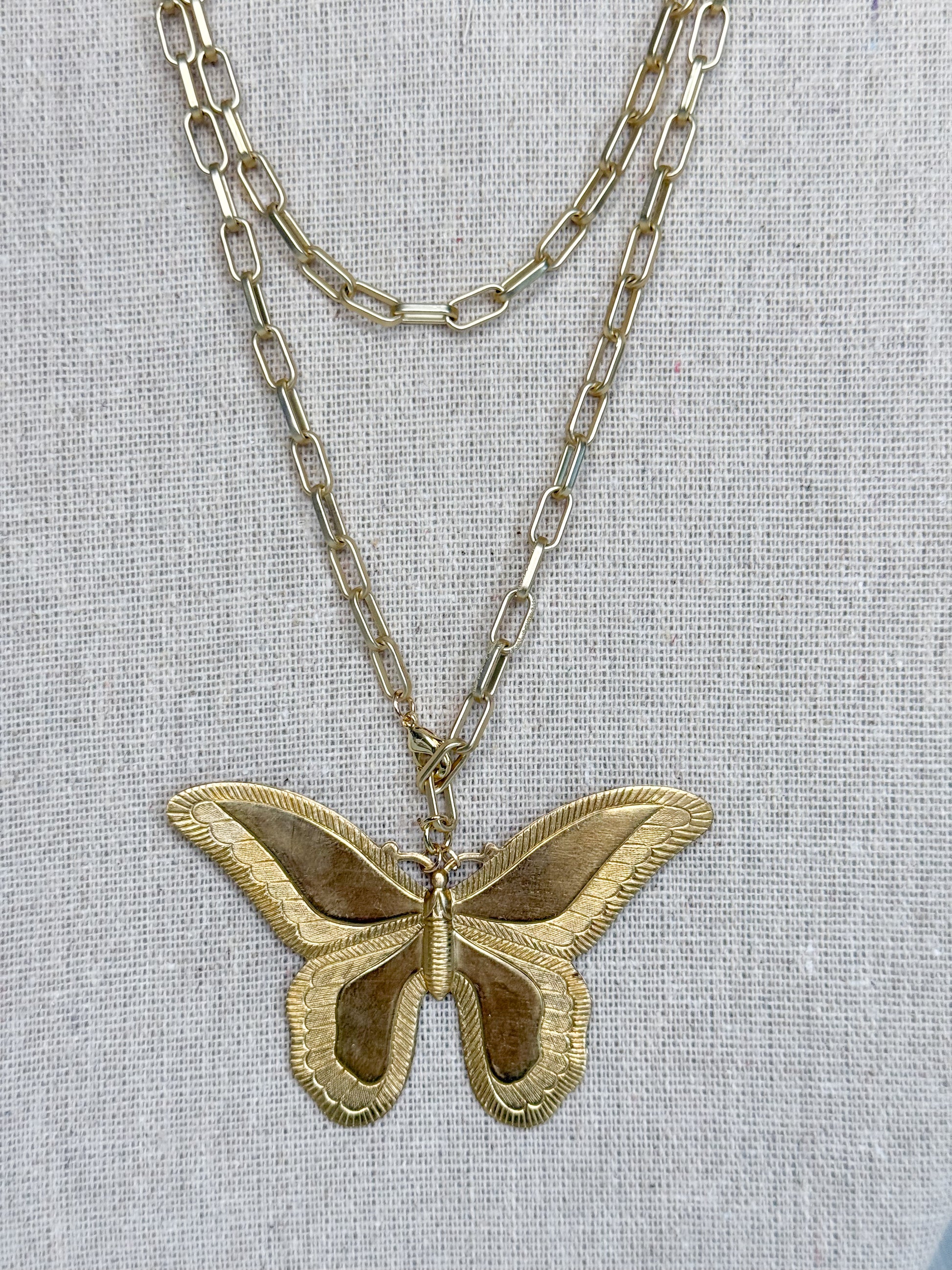 Brass butterfly on gold chain. 31" standard, adjustable to be longer as shown in photos.