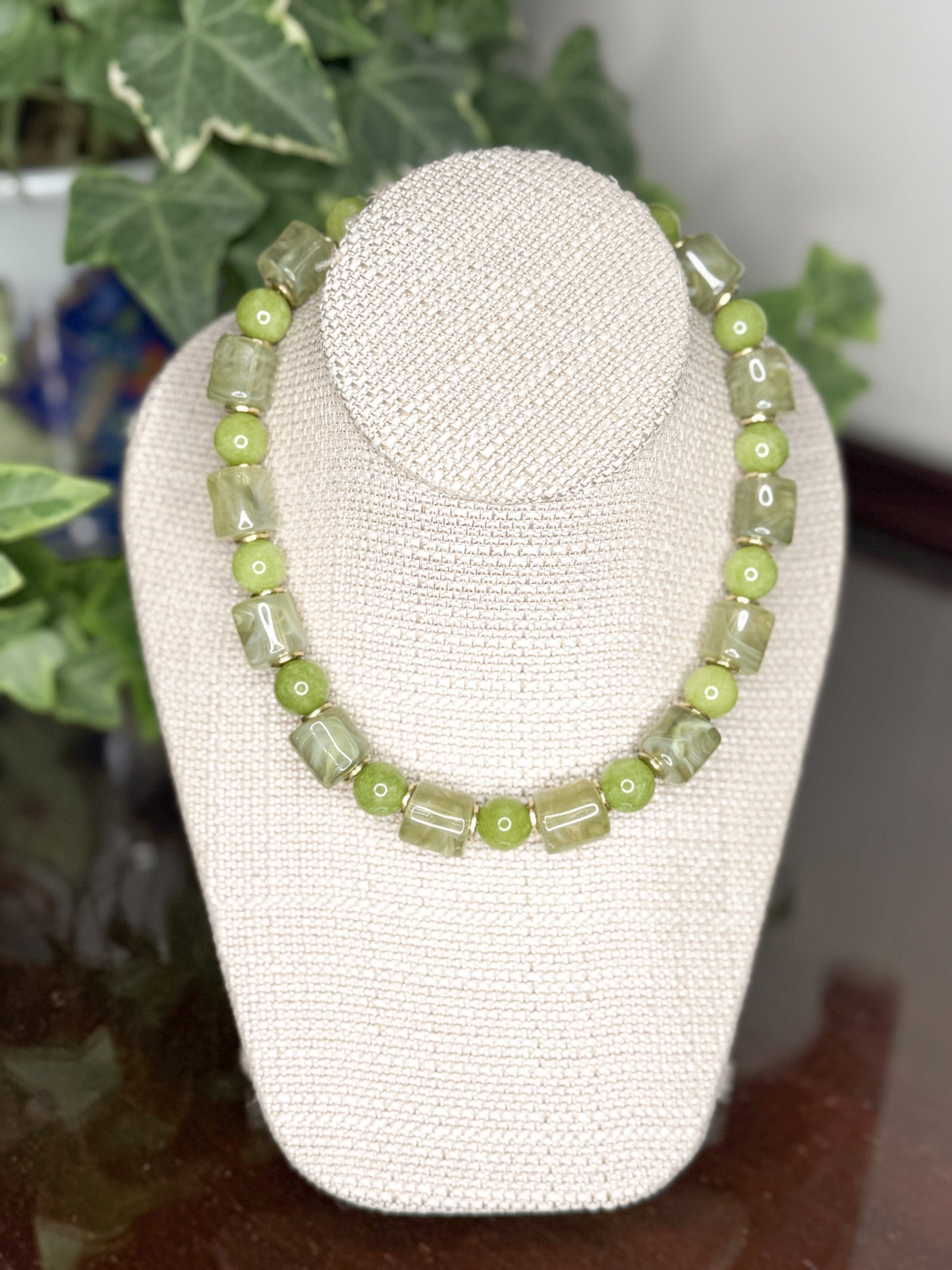 This elegant necklace features luminous green quartz beads strung to a comfortable 17-inch length, secured with a reliable magnetic clasp for effortless fastening and removal. The natural beauty of the quartz complements any ensemble while offering the practical convenience of magnetic closure.