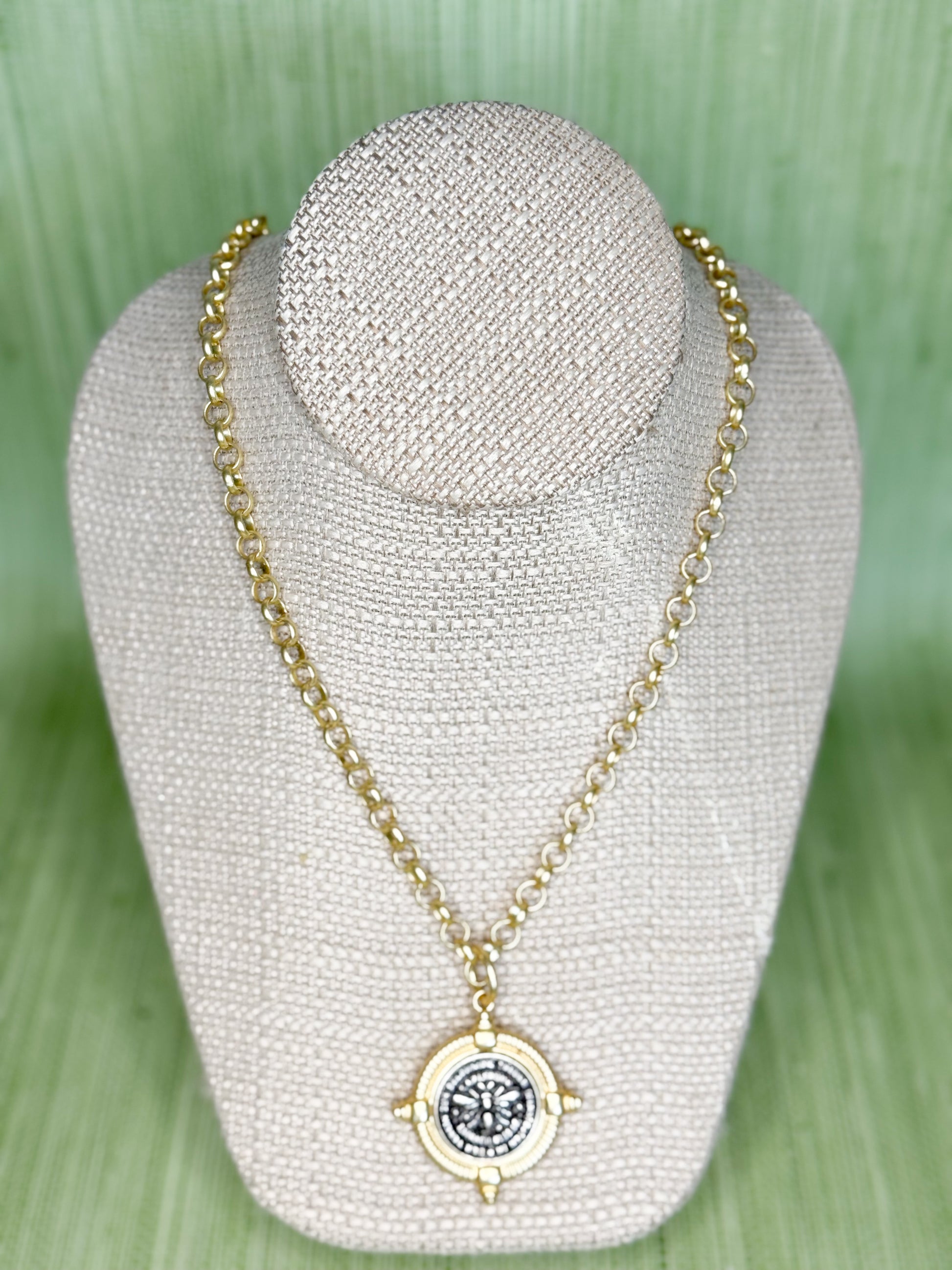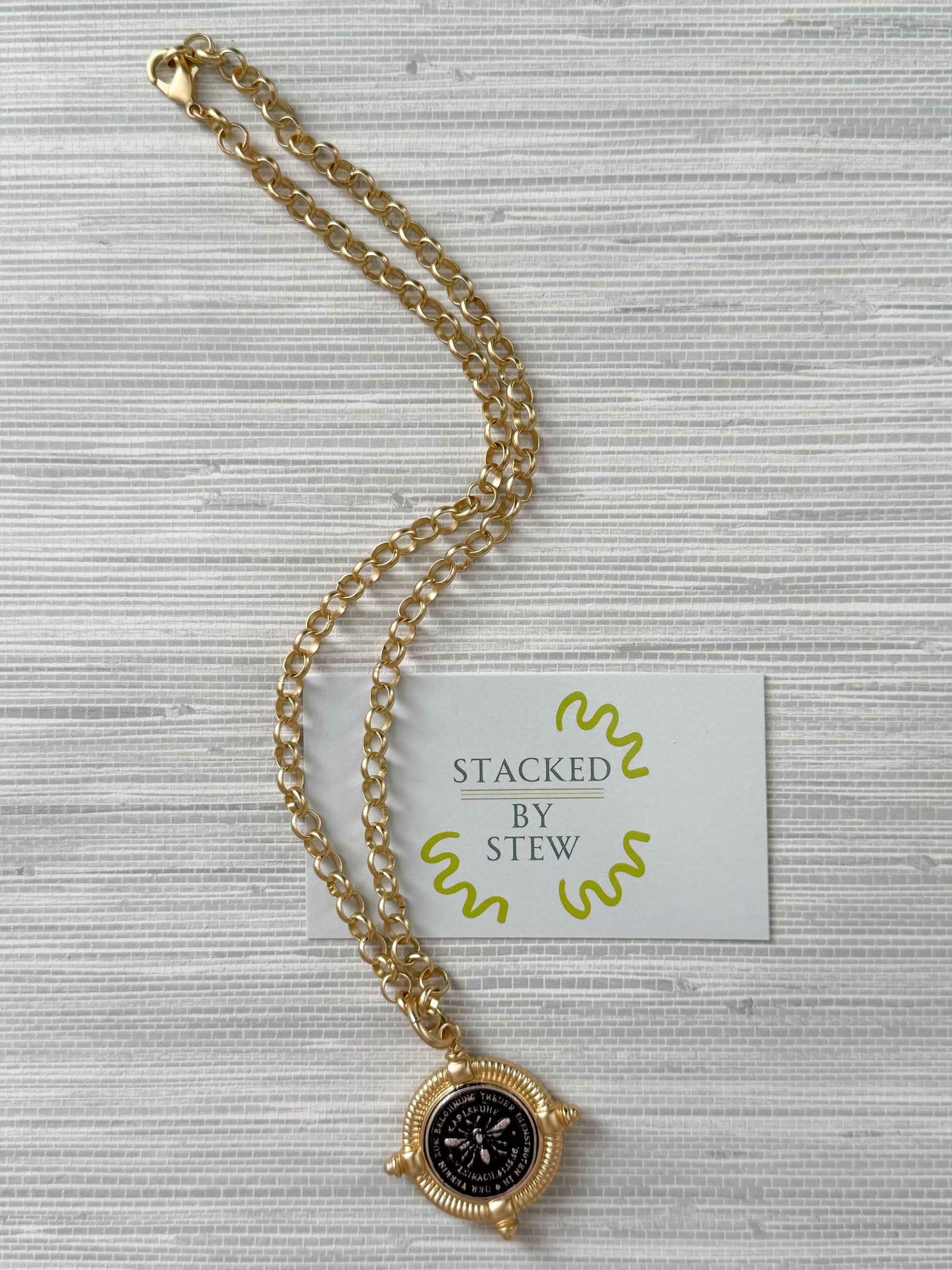 This matte gold necklace features a detailed French bee. The chain is adjustable up to 19”.