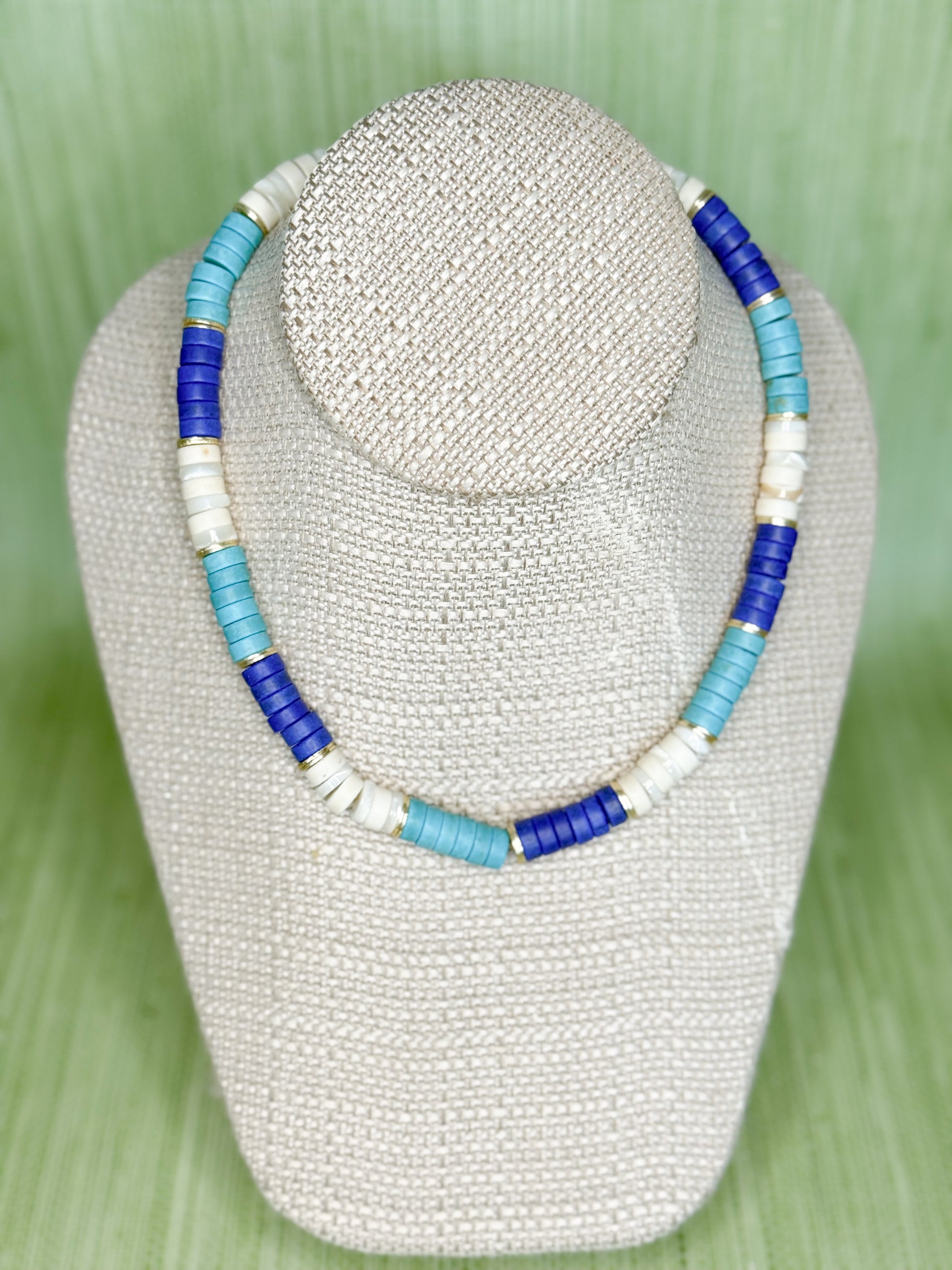 This piece will have you beach dreaming with pretty blue hues in a color block design.15-17" adjustable length.. Magnesite blues and shell beads with gold spacer accents. This necklace stands alone or layers well.