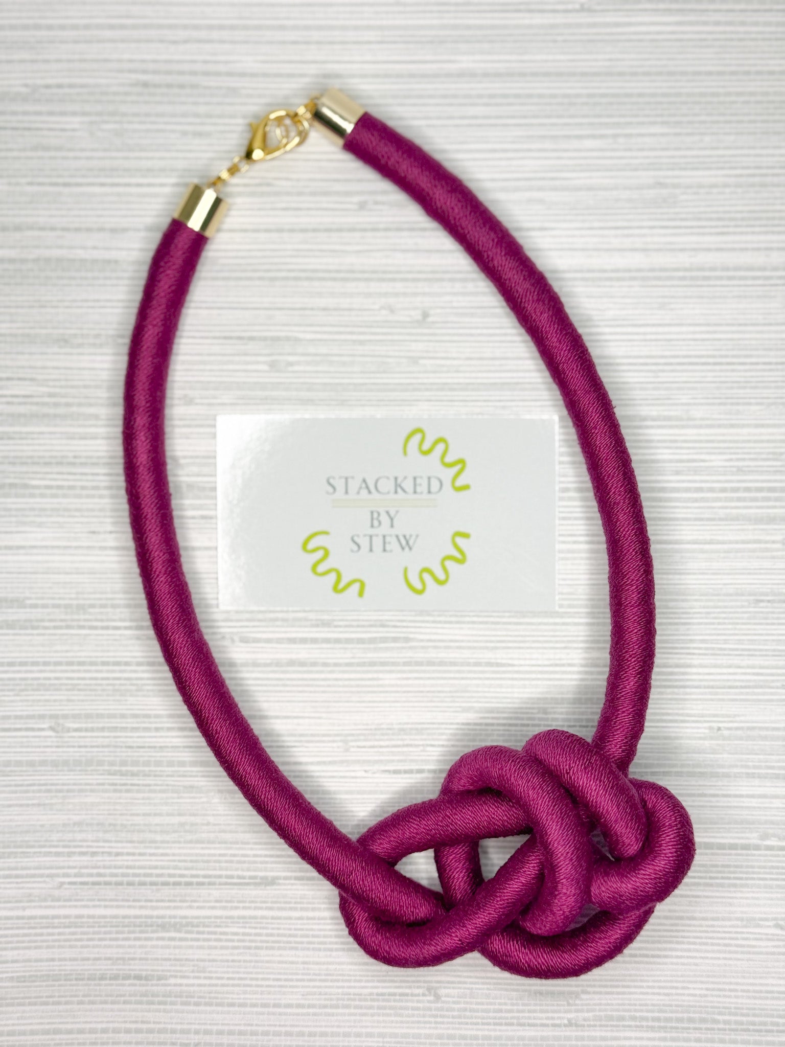 Bold, colorful, and endlessly versatile. Our best-selling Knotty Necklace in Magenta features 38" of intricately wrapped cording in select yarns, finished with brass end caps and a gold-plated lobster clasp for a touch of luxe.