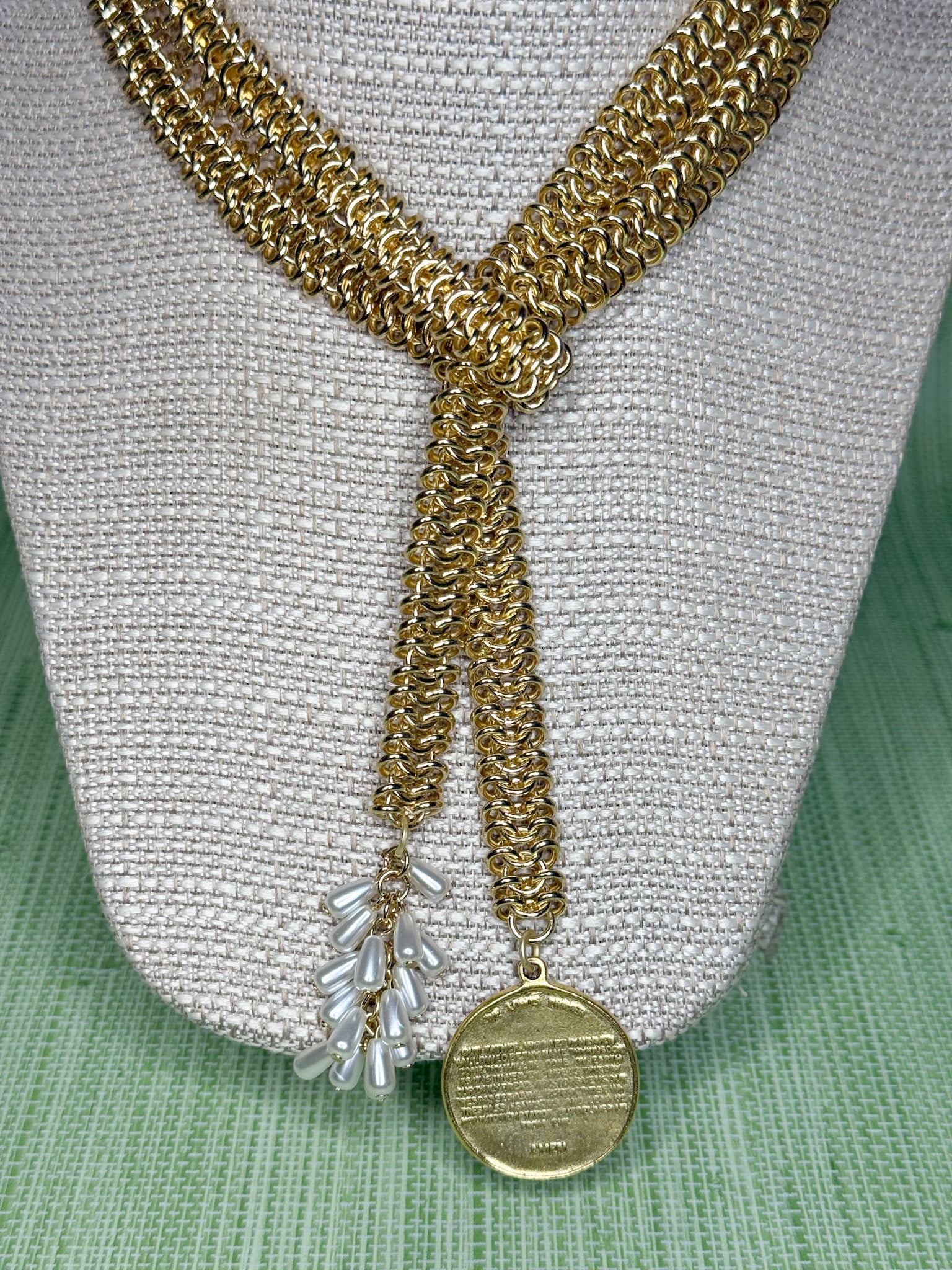 A classic style! This chunky single chain gold plated brass necklace can be worn in many ways. One ending features pearl clusters, with the other ending featuring a charm that is a gold cross and Lord's Prayer. Chain is a total of 36"