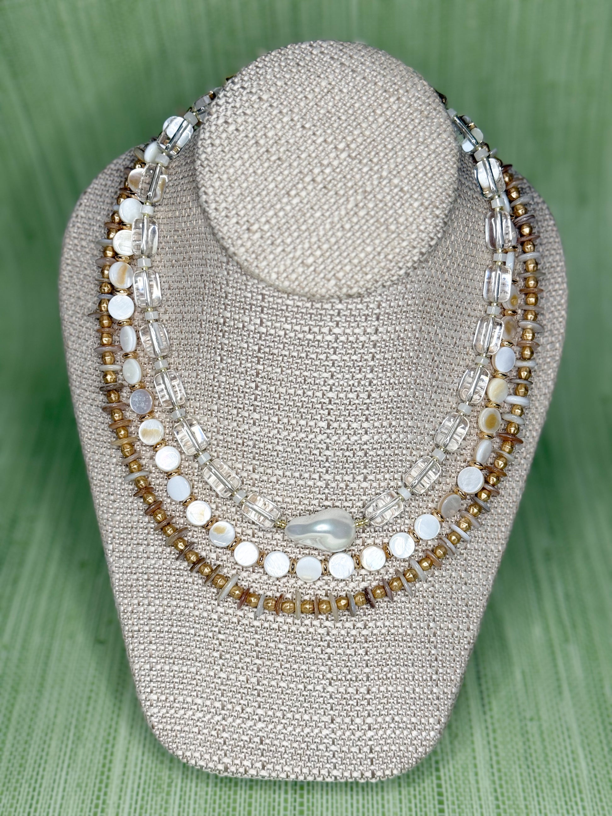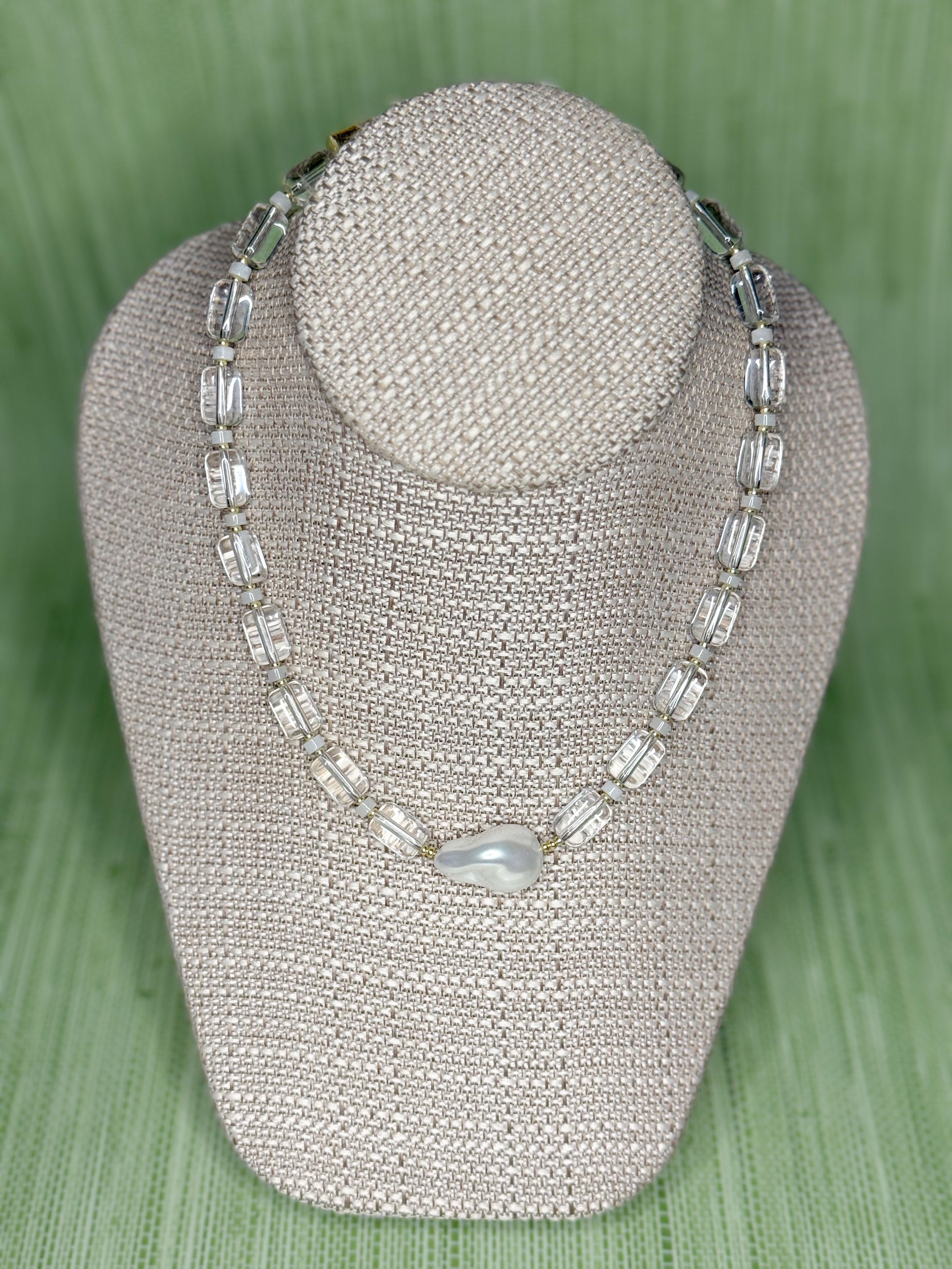 Acrylic, gold and pearls unite! This 16.5" necklace is perfect for stacking, finished with a magnetic clasp