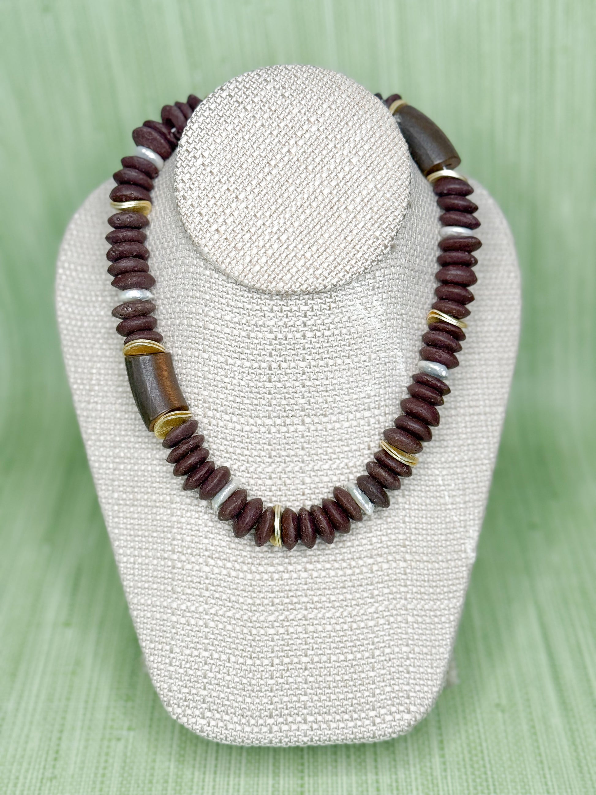 Chocolate, gold and pearl mixed media necklace. 17" with magnetic clasp