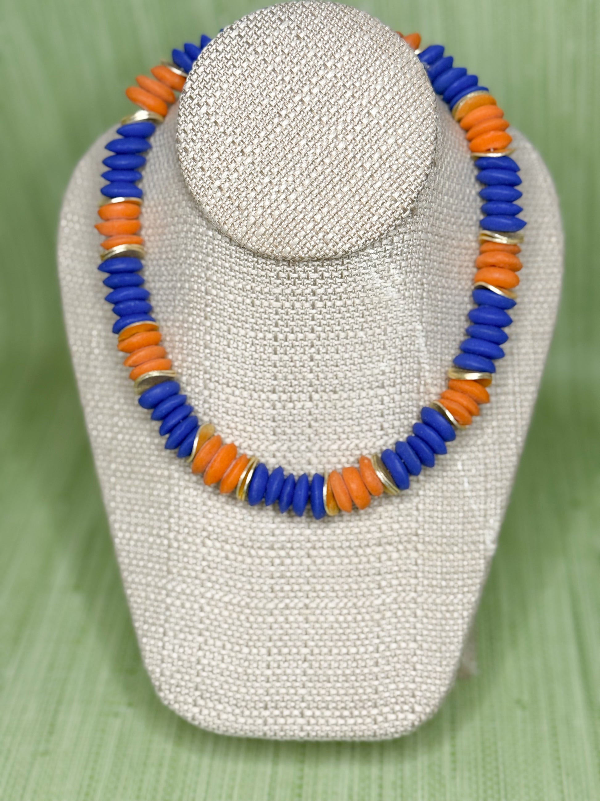Orange and blue beads with gold touches and magnetic clasp. 17"