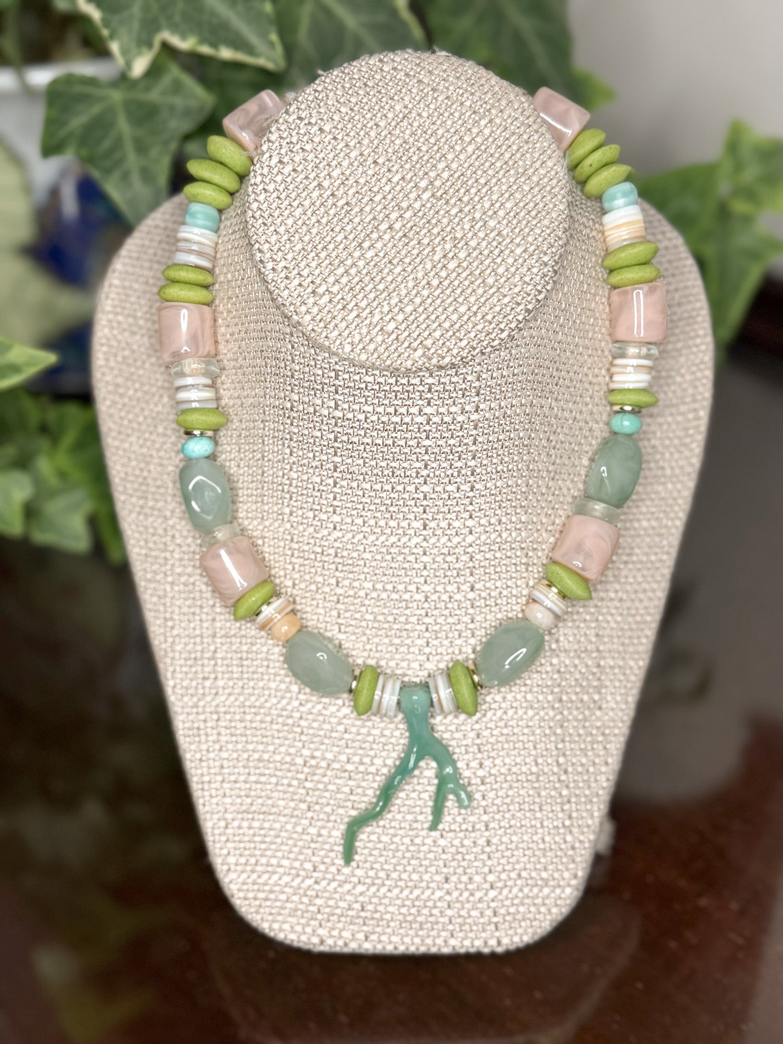 This vibrant mixed media necklace brings together green, pink, and turquoise hues, all anchored by a striking coral pendant. Measuring 16.5 inches with an easy-to-use magnetic clasp, it's the perfect length for layering or wearing solo. A fun pop of color for any outfit!